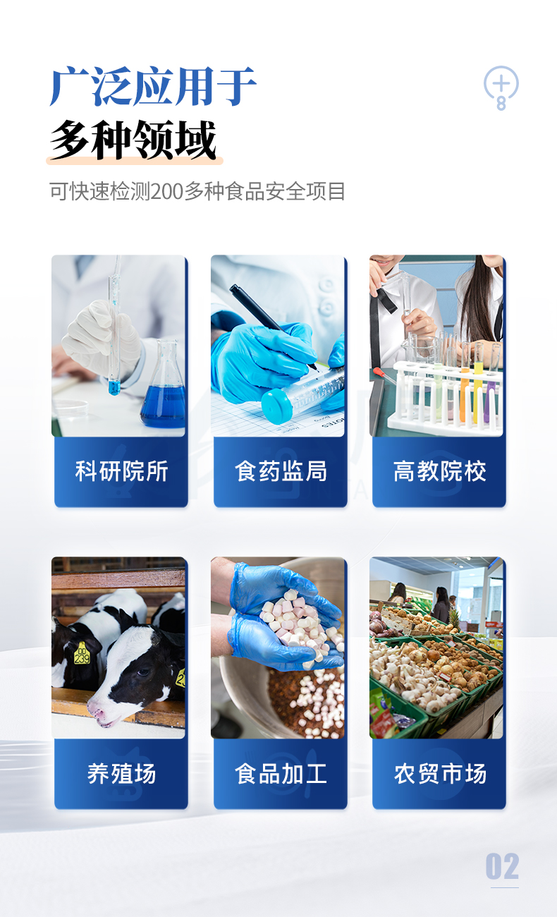 該食品快檢儀為集成化食品安全快速檢測分析設(shè)備,目前已于食藥監(jiān)局、衛(wèi)生部門、高教院校、科研院所、農(nóng)業(yè)部門、養(yǎng)殖場、屠宰場、食品肉產(chǎn)品深加工企業(yè)及檢驗(yàn)檢疫部門等單位廣泛使用。