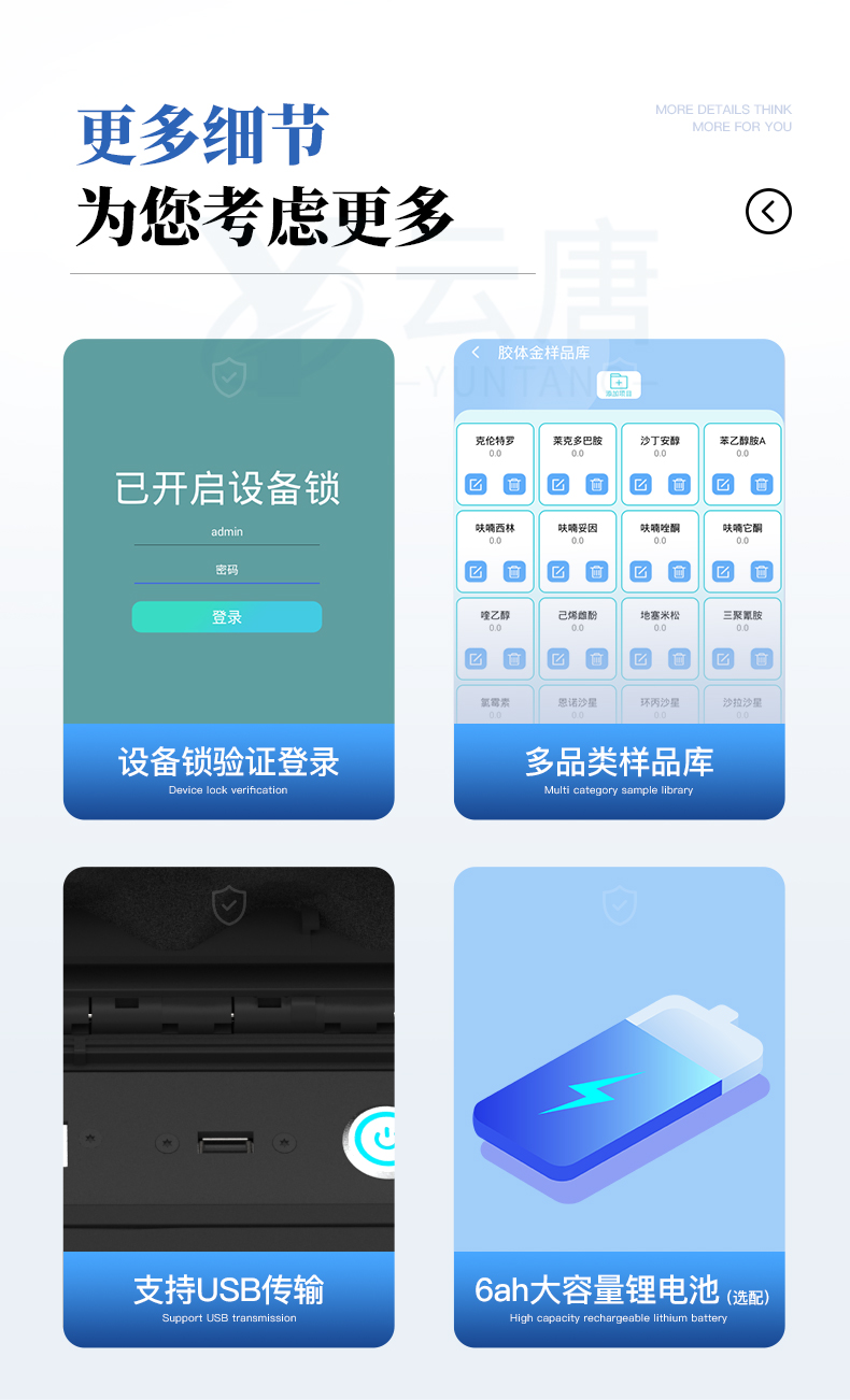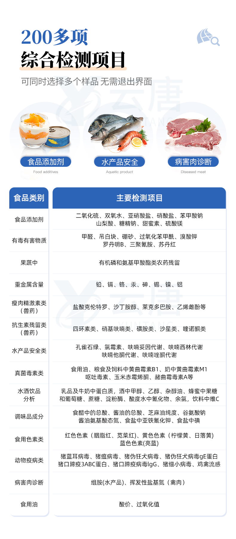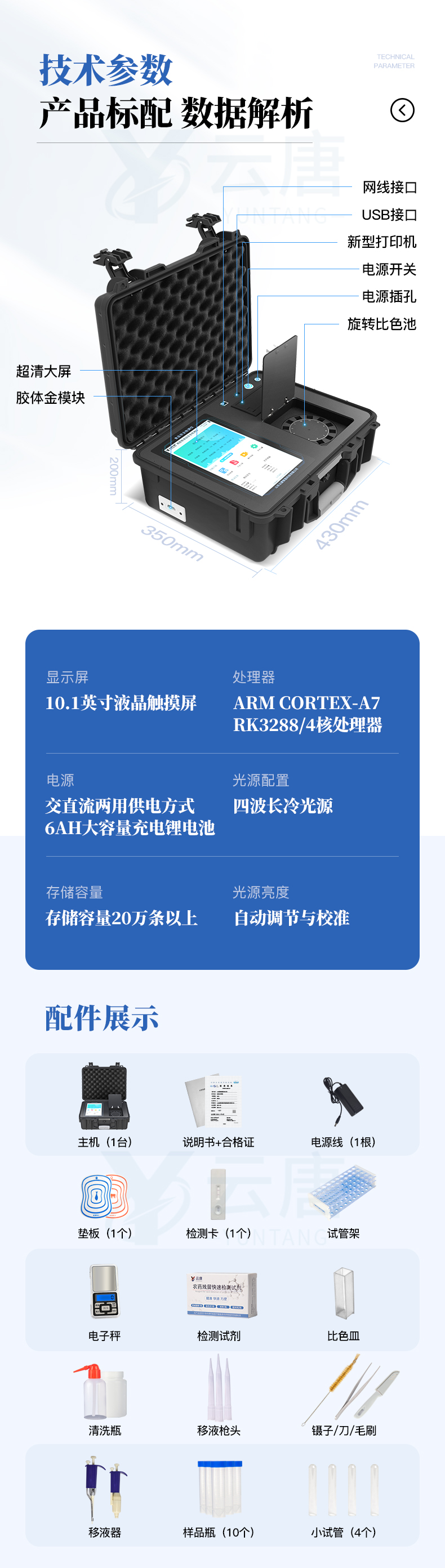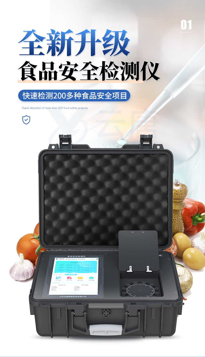 山東云唐智能科技有限公司生產(chǎn)的高智能食品安全檢測儀可快速檢測200多種食品安全項(xiàng)目,包含非食用化學(xué)物質(zhì)、濫用食品添加劑、農(nóng)藥殘留、獸藥殘留、重金屬、病害肉、營養(yǎng)強(qiáng)化劑、抗生素類殘留、激素類殘留、真菌毒素類殘留、化學(xué)類殘留等項(xiàng)目的定性定量檢測。