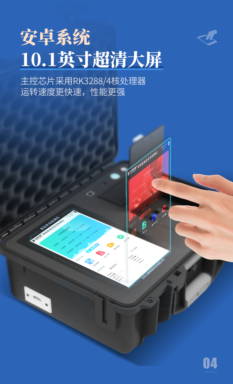 1、儀器采用10.1英寸液晶觸摸屏顯,搭配運(yùn)行安卓智能操作系統(tǒng),主控芯片采用ARM Cortex-A7,RK3288/4核處理器,主頻1.88Ghz,運(yùn)轉(zhuǎn)速度更快速,性能更強(qiáng)。