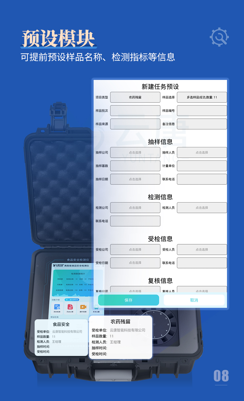 *6、儀器具有任務(wù)預(yù)設(shè)模塊,可在樣品送檢前提前預(yù)設(shè)樣品名稱、檢測指標(biāo)、送檢單位等信息,樣品送檢時(shí)一鍵調(diào)取保存信息,檢測更加方便快捷。