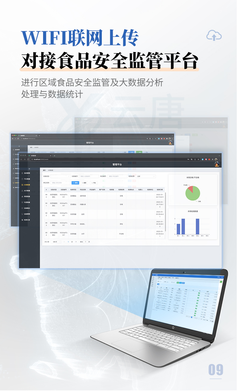 12、儀器具有 wifi 聯(lián)網(wǎng)上傳、RJ45網(wǎng)線連接功能,可以快速上傳數(shù)據(jù)。同步對(duì)接監(jiān)管平臺(tái),數(shù)據(jù)可局域網(wǎng)和互聯(lián)網(wǎng)數(shù)據(jù)上傳,檢測結(jié)果直接傳至食品安全監(jiān)管平臺(tái)。進(jìn)行區(qū)域食品安全監(jiān)管及大數(shù)據(jù)分析處理與數(shù)據(jù)統(tǒng)計(jì),檢測區(qū)域食品安全長短期動(dòng)態(tài),達(dá)到食品安全問題預(yù)估、預(yù)警。