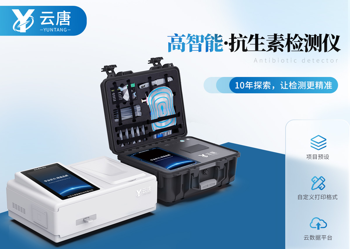 山東云唐智能科技有限公司生產的抗生素殘留檢測儀可現場快速檢測抗生素類殘留、獸藥殘留、激素類殘留、毒素類殘留,化學類殘留等多種項目,如可快速檢測四環素類、硝基呋喃類、磺胺類、沙星類、喹諾酮類、氯霉素、慶大霉素、鏈霉素、喹乙醇代謝物、硫酸鏈霉素、羧芐青霉素、噻孢菌素鈉、阿莫西林、氨芐西林、紅霉素、潮霉素B、安普霉紊、桿菌肽等抗生素快速檢測;還可檢測激素類:鹽酸克倫特羅、沙丁胺醇、萊克多巴胺、己烯雌酚等,水產獸藥:呋喃妥因代謝、呋喃西林代謝、呋喃它酮代謝、呋喃唑酮代謝、孔雀石綠等,毒素類:黃曲酶毒素B1、嘔吐毒素、玉米赤霉烯酮、赭曲霉毒素A等,化學類藥物:氨丙琳、甲基吡啶磷、阿滅丁、雙甲脒、阿散酸、阿維菌素、氮哌酮、芐青霉家、頭孢噻呋、克拉維酸、氯羥吡啶等項目。